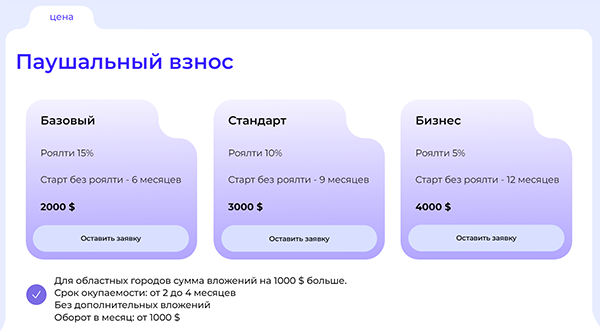 | Паушальный взнос | Базовый — 2000$, Стандарт — 3000$, Бизнес — 4000$ |