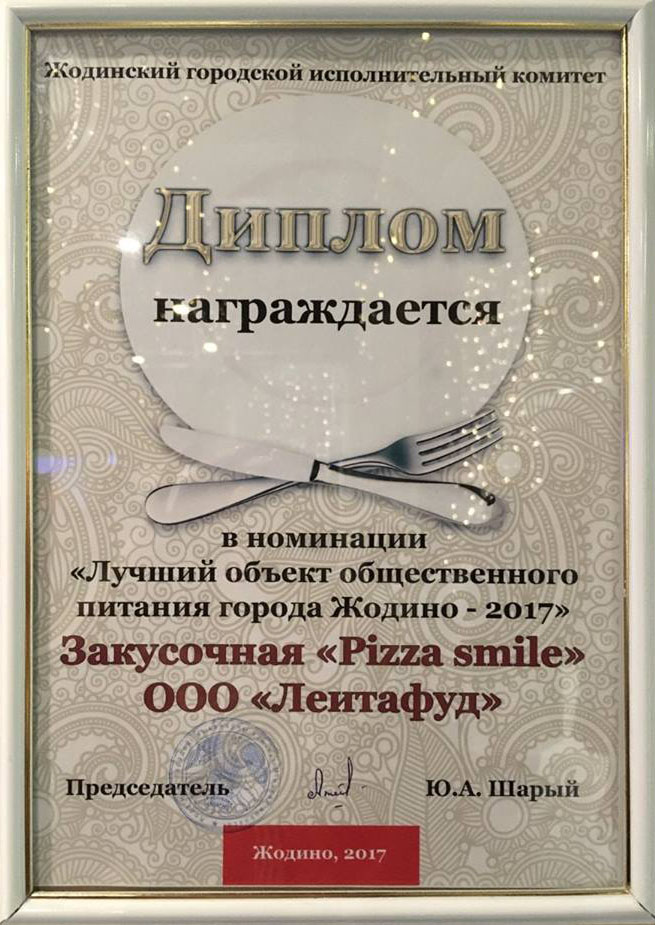 Pizza Smile в Жодино открылась 28 сентября 2016 и стала первым заведением в Беларуси, открытым по франшизе в сфере общественного питания национальной компанией. Несмотря на то, что пиццерия работает чуть больше одного года, ее владельцы с первого же месяца работы смогли выйти на безубыточный уровень доходов и уже успели получить грамоту Жодинского исполкома как лучшее заведение общественного питания в Жодино.