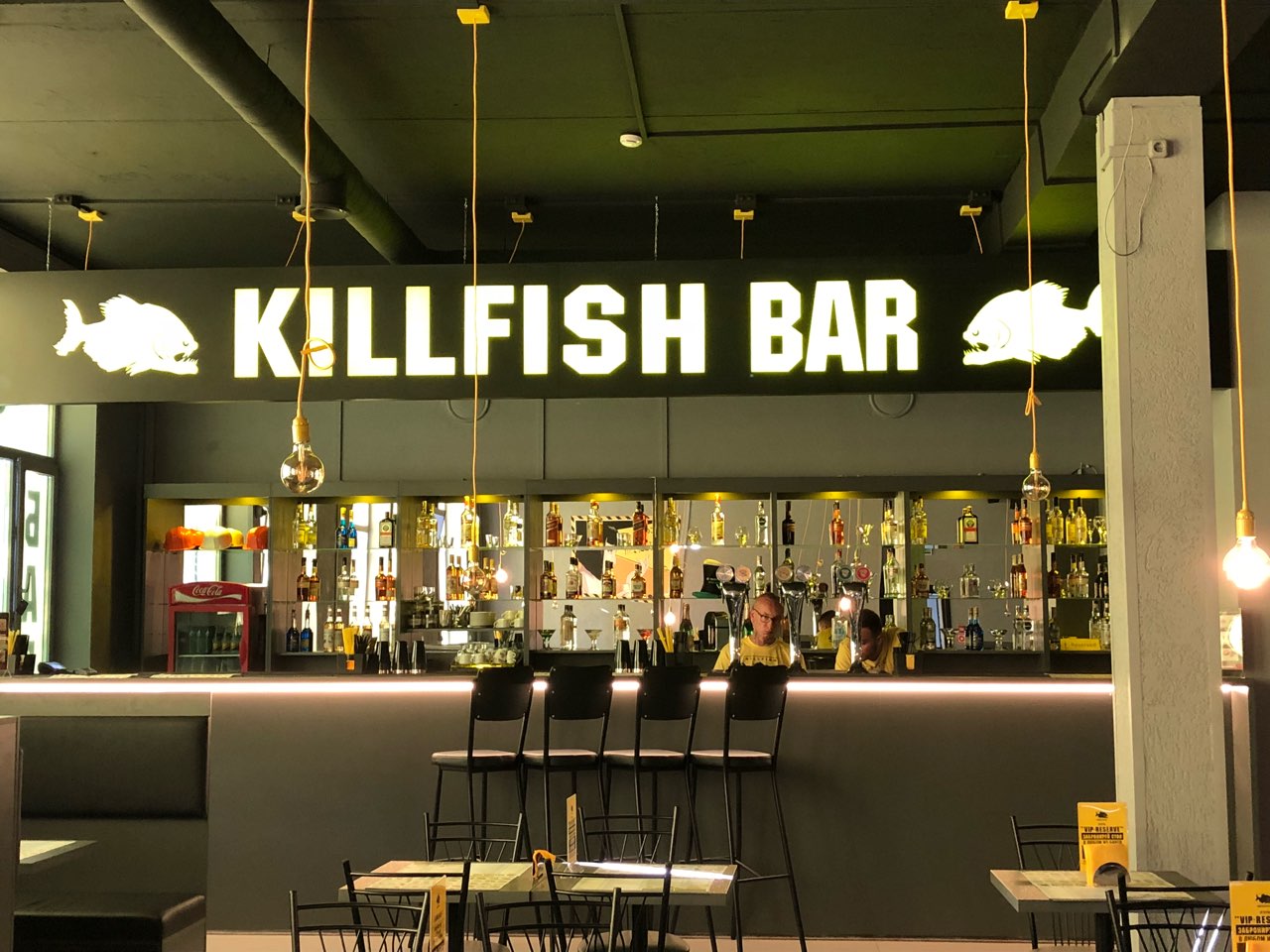 Дискаунт-бар оформлен в стиле классического питерского бара KILLFISH. Несмотря на то, что франшиза предлагает разные варианты посадочных площадей, франчайзи остановился на большом формате - в заведении около 180 посадочных мест.