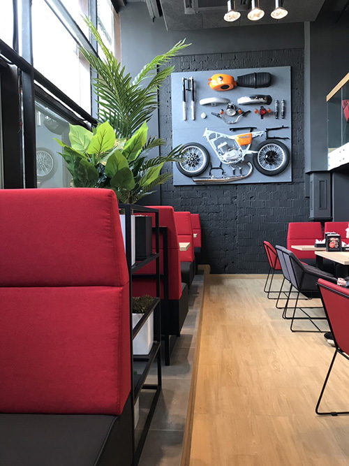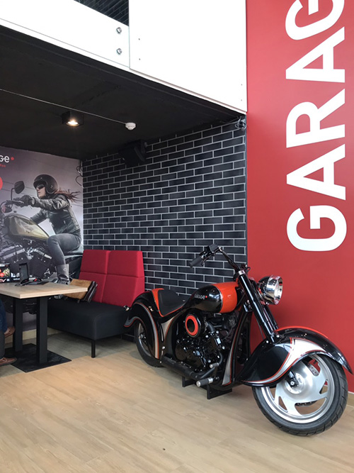 Обстановка комфортна как для семей с детьми (предусмотрена замечательная детская зона с большим лабиринтом), так и для больших компаний. Есть уютные столики для влюбленных пар. Традиционно, основной фишкой в интерьере стало размещение в зале мотоцикла работы известного кастомайзера.